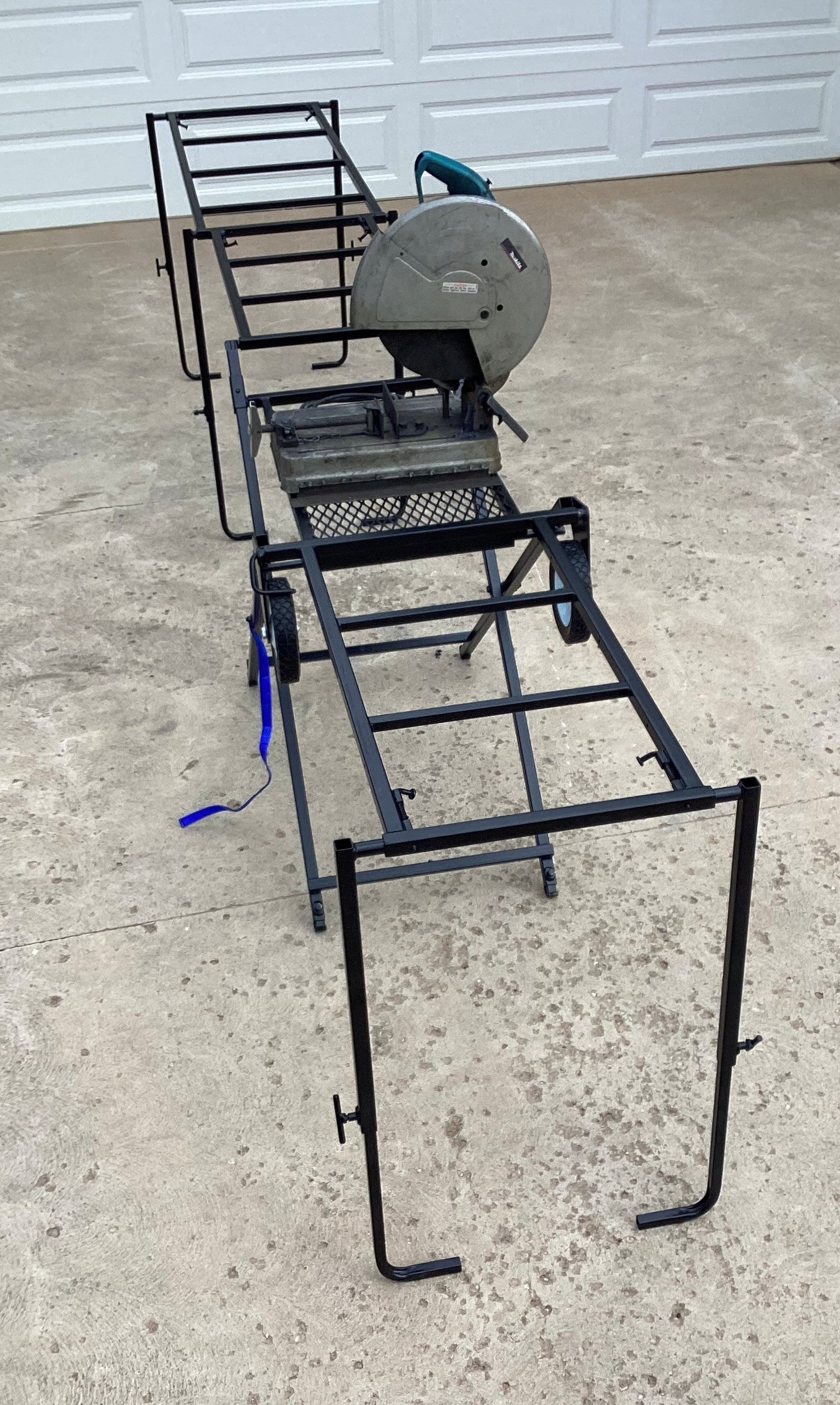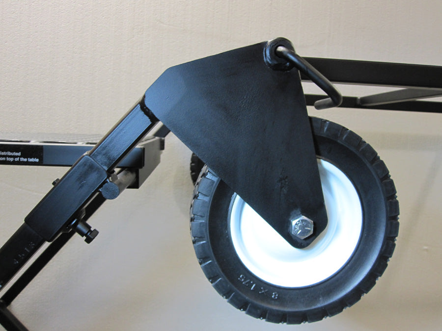 The Complete Power Bench® has two drop legs on one side and 4 drop legs on the other that are adjustable to match the terrain so you still have a flat plain to work on. The stand weighs approximately 95 pounds. But, you only lift half at a time. Since it rolls on wheels you can tip load it into a truck box. The extension is a separate piece. The wheels are 8 inch, good quality grade rubber lawn mower wheels with metal hubs and bearings and won't go flat. Stop rails are made of 3 telescoping tubes that work right or left handed and extend beyond the Power Bench® for even longer multiple cuts. You can add a dock plate to turn them into a handcart.