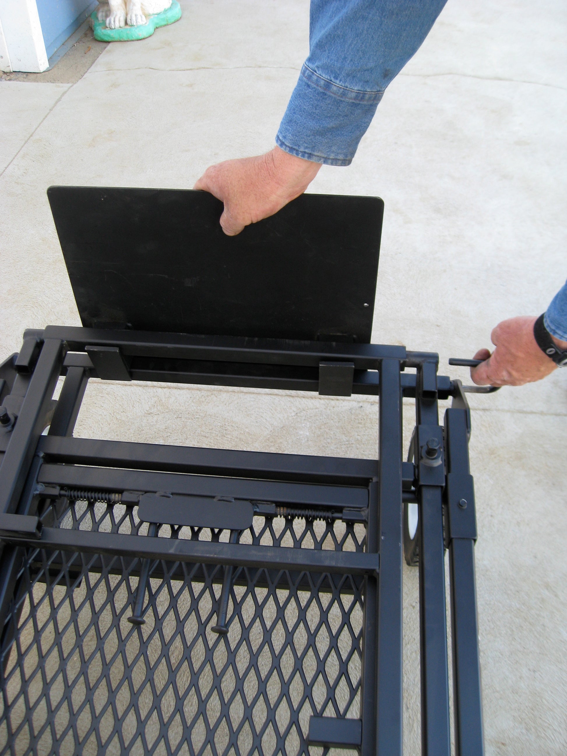 The Power Bench® can be turned into a useful dolly cart for moving your tools and/or supplies from one place to another using the dock plate. This installs quickly onto your folded Power Bench®. Simply lay the Power Bench® flat with the wheels on the floor. Then pull the U-pin out and lift up on the part you just unpinned and insert the dock plate and reattach the U-pin. Pick up the handle end and roll it away. When not in use, the dock plate stores in minimal space.